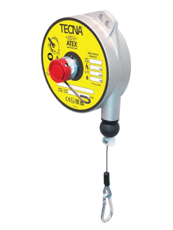TECNA 9321AX explosion-resistant (ATEX-rated) retractor tool balancer FOR SALE at Weld Systems Integrators. For installation in hazardous conditions, including explosive areas containing flammable gases or combustible dust. ATEX certified to Ex II 2G c T6 and Ex II 2D c T85°C. Provides nearly weightless tool operation for 4.4 – 8.8 lbs. (2.0 – 4.0 kg) loads.
